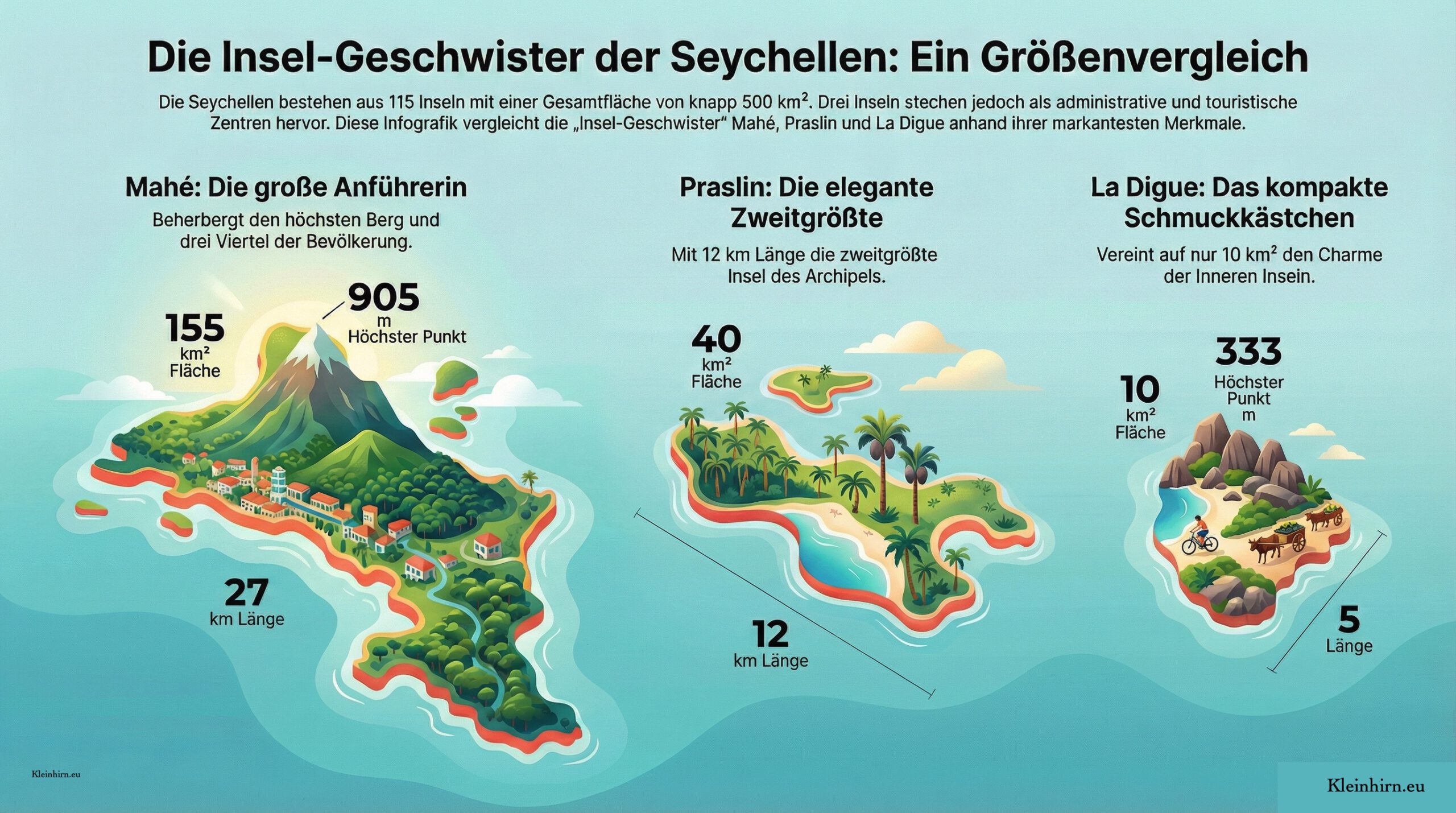 La Digue wird mit einer Fläche von 10 km² beschrieben und als „Schmuckkästchen der Inneren Inseln“ bezeichnet